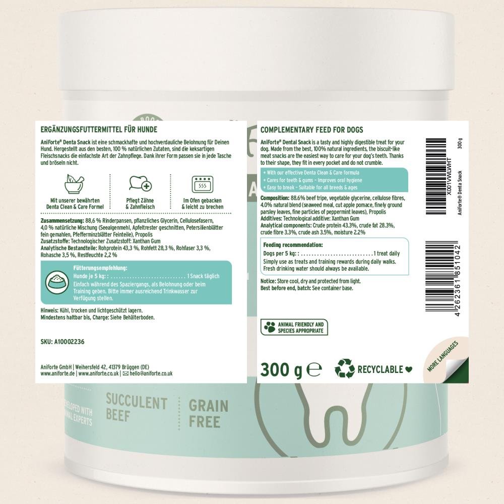 AniForte® Denta-Snacks zijn uitsluitend gemaakt van de allerbeste, 100% natuurlijke ingrediënten. Door hun vorm passen ze gemakkelijk in elke zak en kruimelen ze niet. Dankzij de biscuitachtige textuur zijn ze eenvoudig te breken en geschikt voor alle harige vrienden, groot en klein. De Denta-Snacks zijn zo ontworpen dat ze tijdens het kauwen langs de tanden schuren, wat helpt bij het verwijderen van tandplak en tandsteen.