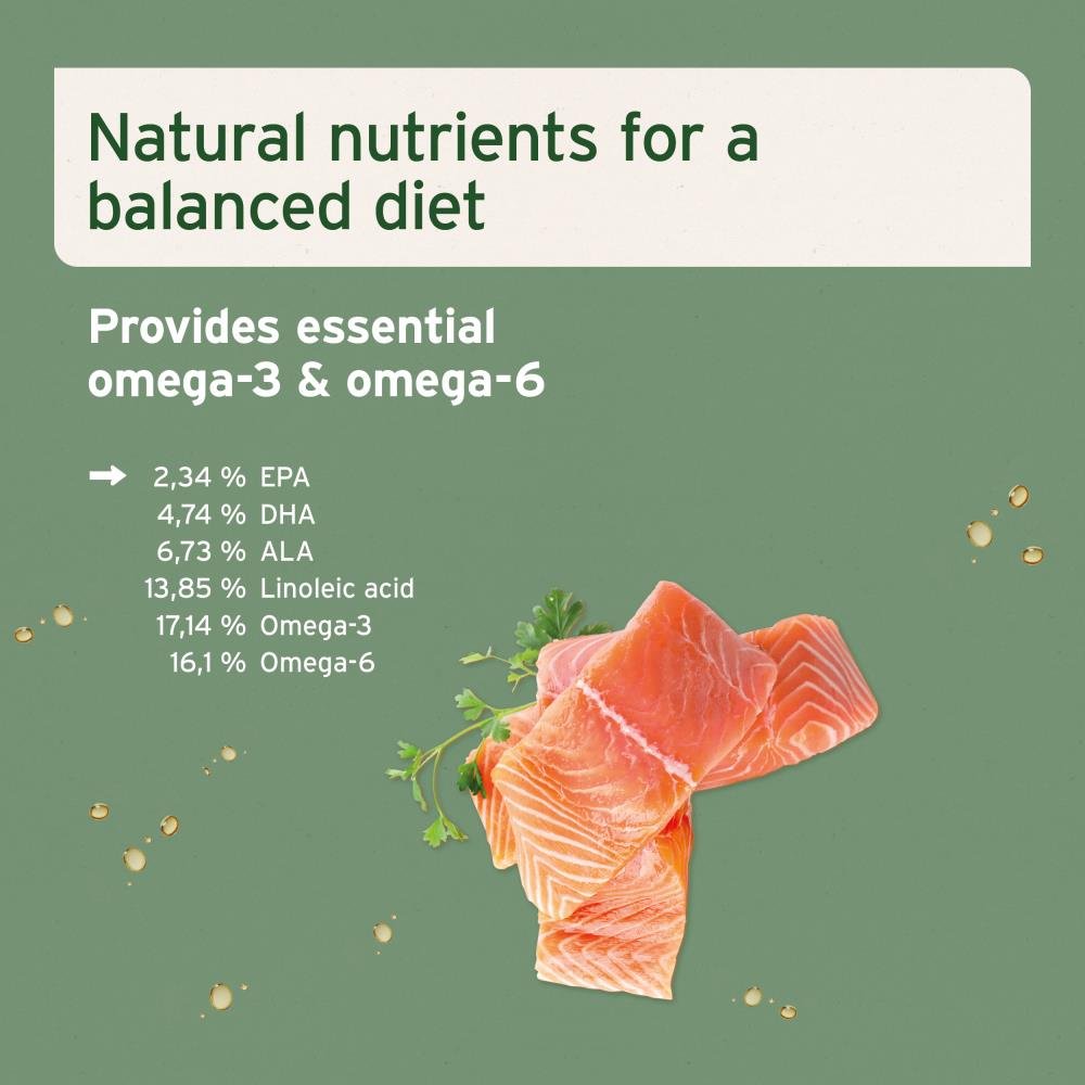 100% Zalmolie (17.1% omega-3-vetzuren, 16.1% omega-6-vetzuren, 13.9% linolzuur, 6.7% a-linoleenzuur (ALA), 4.7% docosahexaeninezuur (DHA), 2.3% eicosapentaeninezuur (EPA), 0.2% arachidonzuur, 0.1% a-linoleenzuur (GLA))