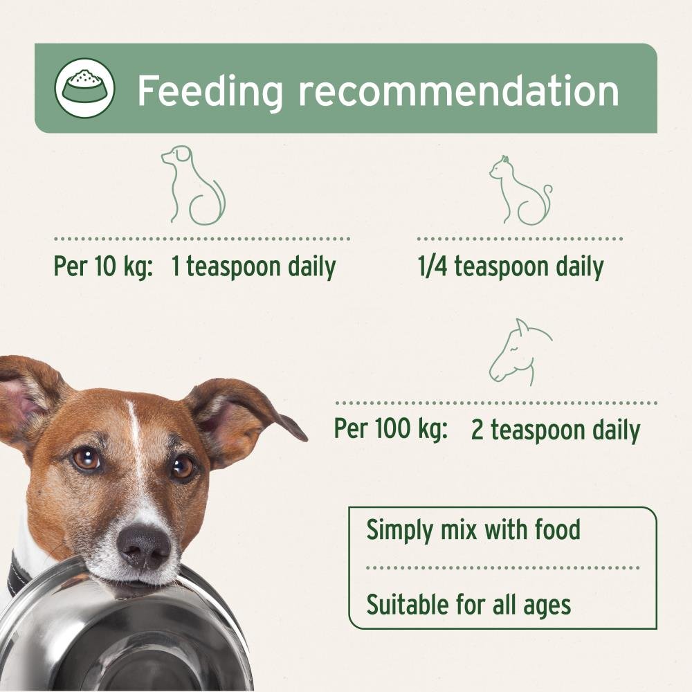 Dogs per 10 kg: 1 teaspoon daily | Cats: ¼ teaspoon daily | Horses & ponies per 100 kg: 2 teaspoons daily. Simply mix the oil into the feed (1 tsp equals approx. 2 ml). Fresh drinking water should always be available.
