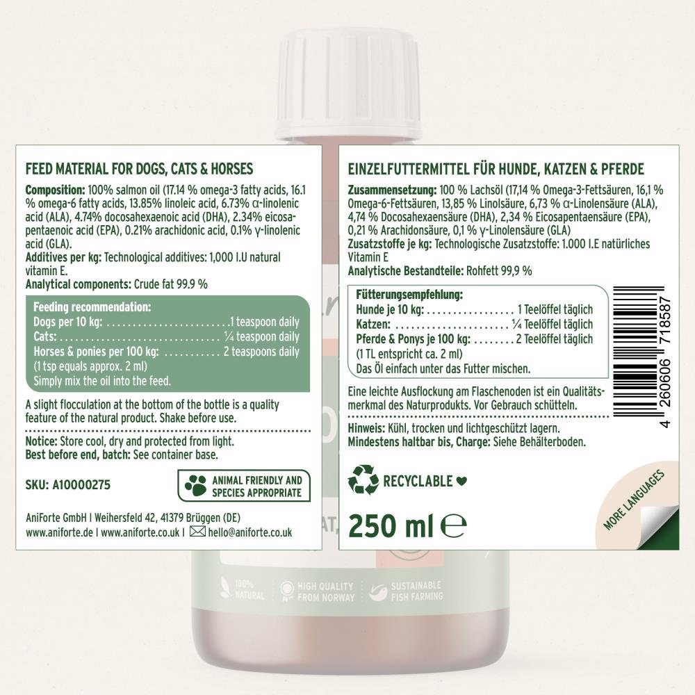 AniForte® Zalmolie is een puur natuurlijk supplement als aanvulling op de dagelijkse voeding van je huisdier. Je kunt de olie eenvoudig toevoegen aan het normale voer of aan het rauwe dieet van je huisdier. De essentiële vetzuren in zalmolie helpen bij het ondersteunen van een optimale gezondheid van de huid en vacht bij honden, katten en paarden. De hoogwaardige visolie uit Noorwegen levert natuurlijke, pure voedingsstoffen en draagt zo bij aan een volwaardig dieet. Dankzij de soortspecifieke smaak en geur wordt de olie zeer goed geaccepteerd.