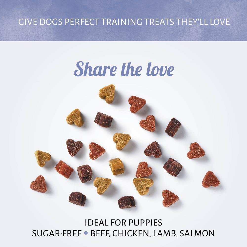 Als je gek bent op je hond, van zijn hoofd tot zijn kwispelstaart, geef je hem Mini Hearts hondensnacks. Deze kwijlwaardige snacks zijn geïnspireerd op de bekende hartjessnoepjes waar we allemaal dol op zijn en zijn een perfecte manier om je trouwste vriend te vieren.
